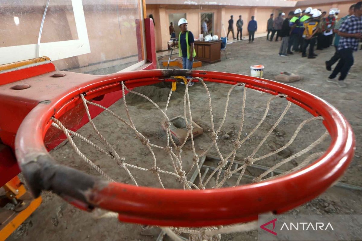 Pekerja menyelesaikan pembangunan arena (venue) Pekan Olahraga Nasional (PON) XXI Aceh-Sumut cabor basket di komplek Stadion Harapan Bangsa, Banda Aceh, Aceh, Kamis (6/6/2024). Penyelenggara PON XXI Aceh-Sumut optimistis mampu menyelesaikan 33 venue cabang olahraga di provinsi Aceh pada awal September mendatang dengan progres pembangunan arena tanding antara 40 hingga 60 persen lebih. ANTARA FOTO/Irwansyah Putra/nym.
